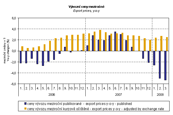 Vývozní ceny se v 1. čtvrtletí 2008 snížily o 4,3 % (ve 4. čtvrtletí 2007 o 1,2 %). Ceny tak ještě prohloubily svůj pokles ze 4. čtvrtletí roku 2007. Výrazný pokles byl způsoben zejména díky pokračujícímu silnému posílení koruny vůči euru a dolaru. Nejvíce klesly ceny průmyslového spotřebního zboží o 6,6 %, strojů a dopravních prostředků o 6,4 % (zvláště zařízení k telekomunikaci a záznamu a reprodukci zvuku) a ceny chemikálií o 5,3 % (zejména barviv). Z významnějších skupin rostly ceny minerálních paliv o 15,6 % (hlavně uhlí) a ceny potravin o 10,3 % (především obilovin a obilných výrobků).