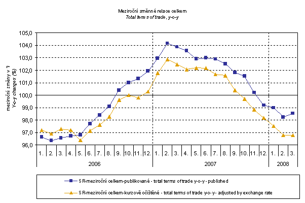 Směnné relace meziročně dosáhly v 1. čtvrtletí 2008 hodnoty 98,7 % (o 1,6 p.b. méně než ve 4. čtvrtletí 2007). Meziroční směnné relace tak dosáhly po pěti čtvrtletích opět negativních hodnot – viz graf níže. Nejnižší hodnota byla zaznamenána u ostatních surovin, a to 95,3 %. Negativních hodnot dosáhly směnné relace také u minerálních paliv - 97,5 % a chemikálií - 98,7 %. Všechny ostatní skupiny dosáhly pozitivních hodnot, z těch významnějších to byly průmyslové spotřební zboží - 100,4 %, stroje a dopravní prostředky - 100,8 % a polotovary - 101,0 %.