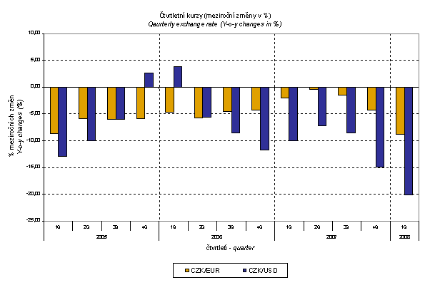 Rozdílné vývoje vývozních a dovozních cen se od 4. čtvrtletí roku 2007 opět sjednotily. Jak bylo již ukázáno výše, na ceny zahraničního obchodu působí řada vlivů, mimo jiné i kurz CZK k zahraničním měnám. Tento vliv je významný, a často i rozhodující, nejmarkantnější je v meziměsíčním vyjádření, velmi výrazný je však i v mezičtvrtletním porovnání a podstatně ovlivňuje i úroveň meziročních indexů cen zahraničního obchodu. V minulém a tomto čtvrtletí kurz koruny rostl mimořádně silně. Vývoj čtvrtletních meziročních změn kurzů je patrný z následujícího grafu.