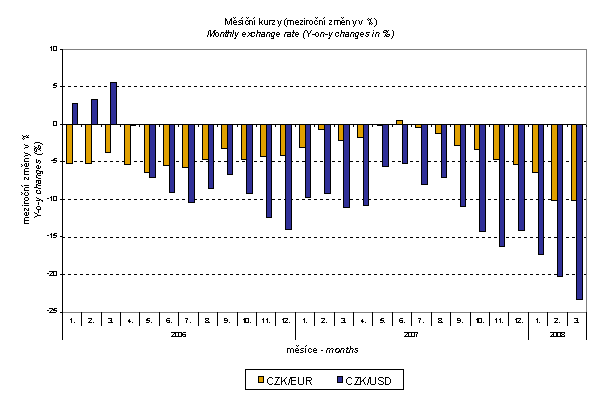 Z grafů je dobře vidět, že mírnější posilování koruny v 1. čtvrtletí 2008 zapříčinilo i mírnější pokles cenových indexů. Nižší tempo poklesu indexů bylo dáno také tím, že v 1. čtvrtletí se zpravidla uzavírají nové dlouhodobější kontrakty.