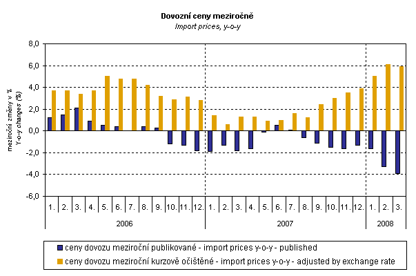 Dovozní ceny se v 1. čtvrtletí 2008 snížily o 3,0 % (ve 4. čtvrtletí 2008 o 1,5 %). Ceny se snížily také zejména vlivem silného kurzu koruny. Nejvíce klesaly ceny strojů a dopravních prostředků o 7,1 % (zejména strojů a zařízení všeobecně užívaných v průmyslu) a ceny průmyslového spotřebního zboží o 7,0 %. Ceny klesaly také u polotovarů o 4,6 % a chemikálií o 4,1 %. Z významnějších skupin výrazněji rostly pouze ceny minerálních paliv o 18,6 % (obzvláště ropy a ropných výrobků).