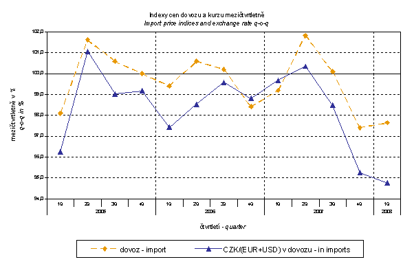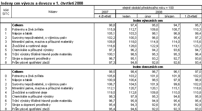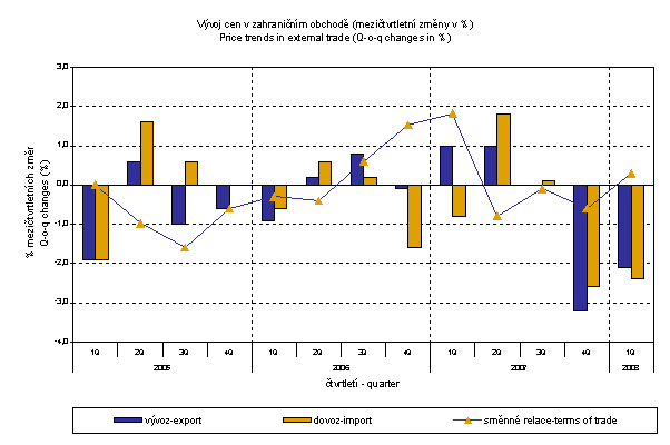 Ceny vývozu se v 1. čtvrtletí 2008 proti 4. čtvrtletí 2007 snížily o 2,1 % (ve 4. čtvrtletí 2007 o 3,2 %), ceny dovozu se snížily o 2,4 % (ve 4. čtvrtletí o 2,6 %).
