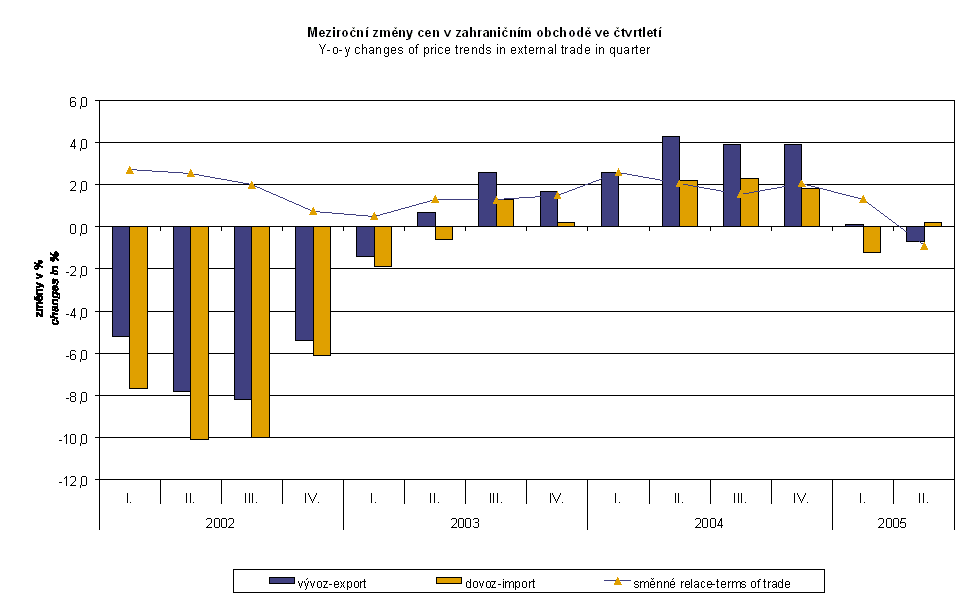 Směnné relace dosáhly meziročně ve 2. čtvrtletí 2005 negativní hodnoty 99,1 % (první negativní hodnota čtvrtletních meziročních směnných relací od cenové revize v roce 2001) a v porovnání s 1. čtvrtletím se tak snížily meziročně o 2,2 p.b. Hodnota směnných relací byla nízká zejména ve skupinách ostatní suroviny (95,8 %), nerostná paliva (96,8 %) a potraviny (97,2 %). Hodnota směnných relací skupiny stroje a dopravní prostředky dosáhla 99,9 % a v porovnání s 1. čtvrtletím se tak snížila o 0,3 p.b. Pozitivní hodnota směnných relací byla zejména ve skupině chemikálie (106,7 %) a hotové výrobky (105,1 %).