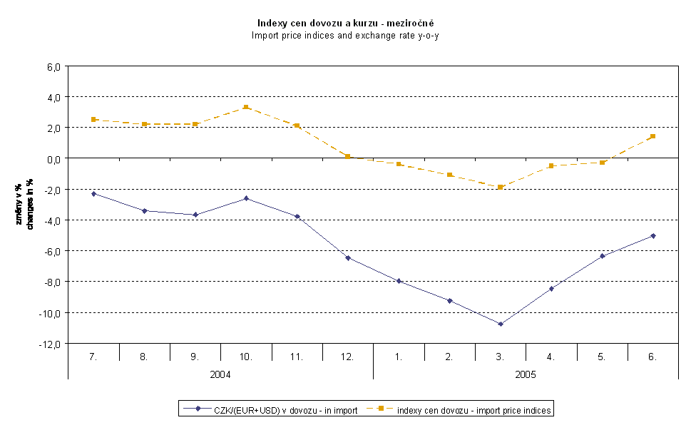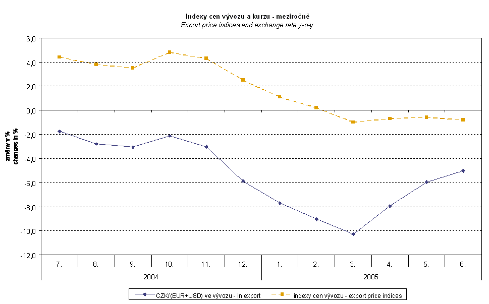 Na vývoj cen zahraničního obchodu působila ve 2. čtvrtletí 2005 řada faktorů. Z těch, které ceny zvyšovaly, to bylo jednak oslabování koruny k hlavním cizím měnám a dále pak růst cen nerostných paliv a zejména ropy na světových trzích. Naopak výrazně se zpomalil růst zahraničních cen rud kovů. Zvláště pak vztah cenových indexů zahraničního obchodu ke kurzu koruny k hlavním cizím měnám je významný, jak je patrné z následujících grafů.