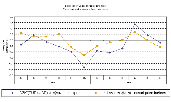 Vývozní ceny se ve 2. čtvrtletí 2005 v úhrnu snížily o 0,7 % (pokles o 0,8 p.b.) a nerostly tak poprvé od 1. čtvrtletí 2003. Působily zde obdobné vlivy, jako u dovozních cen – tedy růst cen ropy a plynu na světových trzích (zvýšení cen nerostných paliv o 22,2 %, tj. o 1,3 p.b., především uhlí, ropných výrobků a plynu) a nižší posílení koruny vůči hlavním zahraničním měnám (snížení cen strojů a zařízení o 4,5 %, ale zároveň růst o 1,1 p.b.). V porovnání s dovozními cenami však u vývozních cen působilo daleko výrazněji snížení růstu cen kovů na světových trzích. Ceny polotovarů se tak zvýšily jen o 0,9 % (tj. pokles o 6,0 p.b., hlavně železa a oceli, kovových výrobků a neželezných kovů) a ceny ostatních surovin se snížily o 2,6 % (zejména rud kovů).
