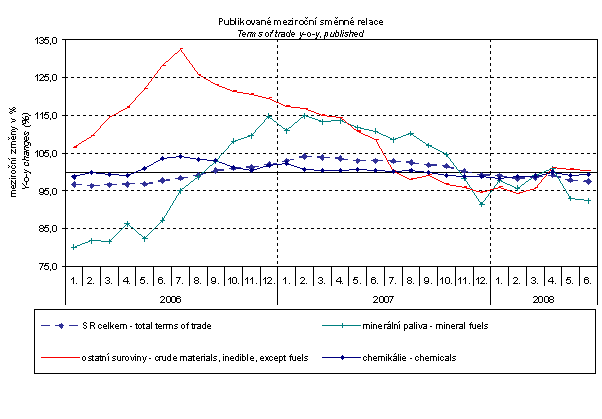 Z výše uvedeného grafu je patrné, že minerální paliva snižovala celkovou hodnotu meziročních směnných relací v období od ledna do srpna 2006, od září 2006 do září 2007 hodnotu směnných relací zvyšovala a od října 2007 do června 2008 minerální paliva opět působí na snižování směnných relací. Souvisí to pochopitelně s vývojem cen na světových trzích, zejména pak ropy. Dovozní ceny, které mají proti cenám vývozním vyšší podíl surovin, reagují citlivěji na cenové turbulence, takže při růstu cen surovin se směnné relace zpravidla snižují a naopak při poklesu cen surovin směnné relace rostou.