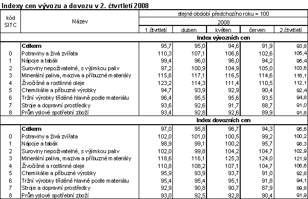 Ceny vývozu se ve 2. čtvrtletí 2008 proti 1. čtvrtletí 2008 snížily o 1,0 % (v 1. čtvrtletí o 2,1 %), ceny dovozu se zvýšily o 0,4 % (v 1. čtvrtletí pokles o 2,4 %).