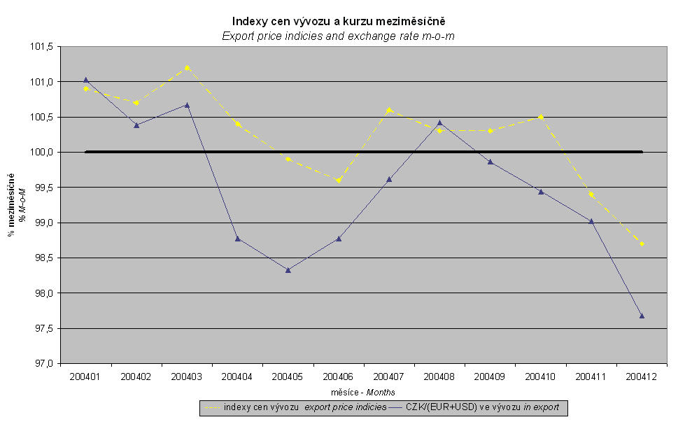 Obdobně při porovnání s meziměsíčními indexy vývozních cen byly meziměsíční indexy kurzů eura a USD váženy vahou, která těmto měnám přísluší v indexu vývozních cen. Korelace tohoto úhrnného meziměsíčního vývozního kurzového indexu a meziměsíčního indexu vývozních cen v roce 2004 činila 0,84.