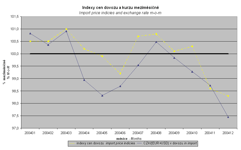 Do meziměsíčního indexu kurzu byly zahrnuty dvě nejvýznamnější měny z hlediska českého zahraničního obchodu, tedy euro a USD, a meziměsíční indexy kurzů CZK k těmto měnám byly váženy vahou, která těmto zahraničním měnám přísluší v indexu dovozních cen. Korelace tohoto úhrnného meziměsíčního dovozního kurzového indexu a meziměsíčního indexu dovozních cen v roce 2004 činila 0,83.