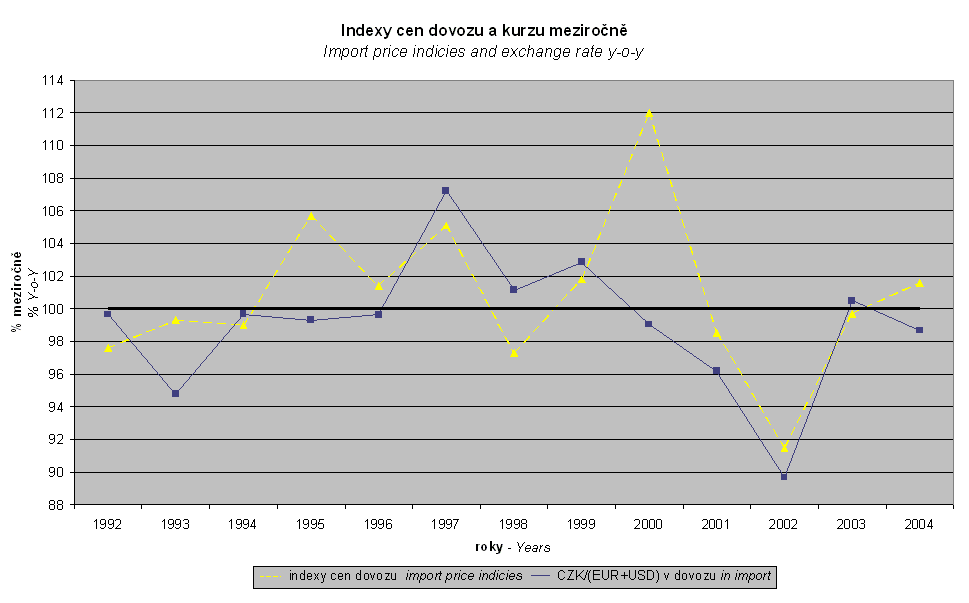 Z grafů je patrné, že v určitých obdobích (např. v letech 2001 – 2003) vývoj kurzu poměrně dobře korespondoval s vývojem indexů cen zahraničního obchodu, zatímco jindy (v posledním období zejména právě v roce 2004) se výrazně rozcházel. A skutečně, korelace mezi jednotlivými měsíci meziročních indexů kurzu a cen činila u dovozu – 0,21 a u vývozu – 0,17. Neznamená to však samozřejmě, že by ceny zahraničního obchodu rostly díky v úhrnu silnější CZK, ale právě naopak, že ceny (a zejména pak světové ceny surovin a potravin) rostly natolik výrazně, že ceny zahraničního obchodu rostly navzdory posilující CZK, případně že posílení CZK bylo natolik malé, že nevyvážilo čistý růst cen. Ukazuje se, že v roce 2004 platilo obojí. Vliv cen byl nadprůměrný (zejména světových cen úhrnem, z toho zvláště ropy a kovů) a úhrnný vliv kurzu byl nejmenší od roku 1996.