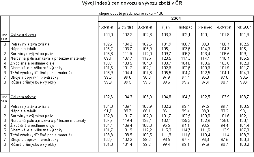 Ceny zahraničního obchodu ve 4. čtvrtletí meziročně rostly, avšak jejich růst se postupně v jednotlivých měsících snižoval. Tento vývoj byl podmíněn jak posilováním CZK k hlavním zahraničním měnám, tak i vývojem světových cen, zejména ropy a kovů. Meziroční index ceny ropy Brent klesal ze 170,3 % v říjnu 2004 přes 155,0 % v listopadu až na 135,8 % v prosinci. Úhrnný meziroční index kovů na světových trzích pak ze 132,0 % přes 128,5 % až na 121,5 %.