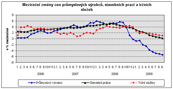 Meziročně se ceny průmyslových výrobců ve 3. čtvrtletí snížily o 5,2 % (v 2. čtvrtletí o 3,6 %). Nejvíce klesly ceny koksu a rafinovaných ropných výrobků o 33,5 %, obecných kovů a kovodělných výrobků o 18,5 % a chemických látek a výrobků o 7,4 %. Ceny potravinářských výrobků se snížily o 5,4 %. Vzrostly především ceny elektřiny, plynu a páry o 10,9 %, vody o 6,9 % a základních farmaceutických výrobků o 3,4 %.