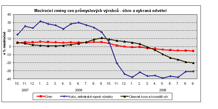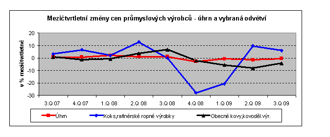 Ve 3. čtvrtletí 2009 se ceny průmyslových výrobců snížily oproti 2. čtvrtletí 2009 o 0,5 %. Nejvíce klesly ceny obecných kovů a kovodělných výrobků o 4,2 %, dopravních prostředků o 2,6 %, počítačů, elektronických a optických přístrojů o 2,4 %. Ceny potravin klesly o 0,8 %. Vzrostly zejména ceny koksárenských a rafinovaných ropných produktů o 6,0 %, chemických látek a výrobků o 5,8 % a elektrických zařízení o 1,3 %.