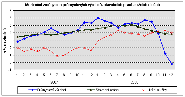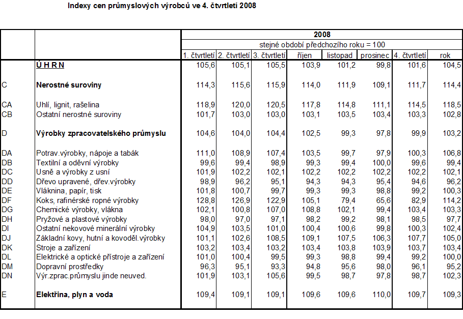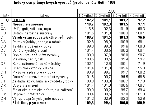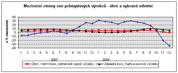 Ve 4. čtvrtletí 2008 se ceny průmyslových výrobců snížily oproti 3. čtvrtletí 2008 o 2,8 %. Nejvíce se snížily ceny koksu a rafinérských ropných výrobků o 28,1 % a chemických výrobků o 4,7 %. Klesly také ceny v odvětví uhlí, lignit, rašelina a ropa o 3,7 %.