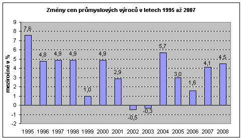 Ceny průmyslových výrobců se v průměru za celý rok 2008 zvýšily o 4,5 %, což je nejvyšší růst za poslední čtyři roky. Na výši cenové úrovně se podílel především růst cen v odvětvích elektřiny, plynu a vody o 9,3 % (zejména elektřiny včetně rozvodu o 11,4 %) a potravinářských výrobků o 6,8 %, a to zejména vysokým vzestupem cen v prvních třech čtvrtletích roku 2008 (11,0 %, 8,9 % a 7,4 %). V posledních 2 měsících roku došlo k poklesu cenové hladiny pod úroveň roku 2007 a to znamenalo pokles růstu cen ve 4. čtvrtletí na úroveň 100,3 %. Výrazně stouply ceny mlýnských a škrobárenských výrobků o 20,9 %, průmyslových krmiv o 19,9 % a olejů a tuků o 24,8 %. Stejný trend jako v potravinářském odvětví byl i v odvětví koksu a rafinérských ropných výrobků, ceny se zvýšily o 14,2 % a také především v prvních třech čtvrtletích roku 2008 (28,8 %, 26,9 % a 22,9 %). V posledních 2 měsících roku došlo k výraznému poklesu cenové hladiny pod úroveň roku 2007 a to se projevilo v poklesu cen ve 4. čtvrtletí na úroveň 82,9 %. Rostly také ceny základních kovů, hutních a kovodělných výrobků o 5,0 % (z toho hlavně železa, oceli a feroslitin o 11,8 %). Klesly pouze ceny textilu o 0,6 %, dřeva a výrobků ze dřeva o 3,8 %, pryžových a plastových výrobků o 2,3 % a dopravních prostředků o 4,8 %.