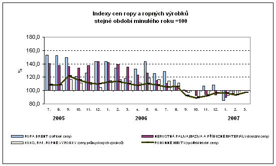 Jak je patrné z grafického znázornění, korespondoval meziroční vývoj spotřebitelských cen pohonných hmot s vývojem světových cen ropy BRENT, dovozních cen skupiny nerostná paliva, maziva a příbuzné materiály i cen průmyslových výrobců rafinérských ropných výrobků. Pokles spotřebitelských cen byl v ČR navíc ovlivněn příznivým vývojem měnových kurzů Kč vůči dolaru.