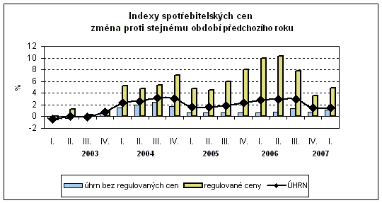Růst regulovaných cen ovlivnily zejména vyšší ceny tabákových výrobků o 5,9 % v důsledku zpožděného vlivu zvýšení spotřební daně v dubnu 2006 a dalšího zvýšení v březnu 2007. V oddíle bydlení, voda, energie, paliva (dále bydlení) vzrostly ceny elektřiny o 7,9 %, vodného o 6,6 %, stočného o 5,5 %. Čisté nájemné se zvýšilo o 4,6 %, z toho v bytech s regulovaným nájemným (u kterých se naposledy upravovalo nájemné v červenci 2002) o 8,2 %. V oddíle rekreace a kultura se zvýšil televizní koncesionářský poplatek o 20,0 % V důsledku změny zákona o poskytování sociálních služeb se zvýšily poplatky za sociální péči o 11,1 %. Opačný vliv na cenový vývoj měl pokles cen zemního plynu o 4,2 %.