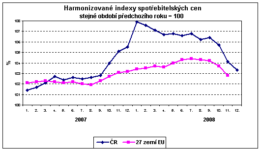 Meziroční přírůstek průměrného harmonizovaného indexu spotřebitelských cen (HICP) 27 členských zemí EU byl podle předběžných údajů v říjnu 3,7 % a listopadu 2,8 %. Nejvíce vzrostly ceny v Lotyšsku (o 13,7 %, resp. 11,6 %). Nejnižší inflaci mělo Německo a Portugalsko (shodně 2,5 %, resp. 1,4 %). Na Slovensku zpomalil cenový růst ze 4,2 % v říjnu na 3,9 % v listopadu. V ČR činil meziroční růst HICP v říjnu 5,7 %, v listopadu 4,1 % a podle předběžných propočtů byl v prosinci 3,3 %, což jsou hodnoty vyšší než průměr EU 27. Rozdíl v cenovém růstu se však v posledních měsících roku 2008 významně snížil.