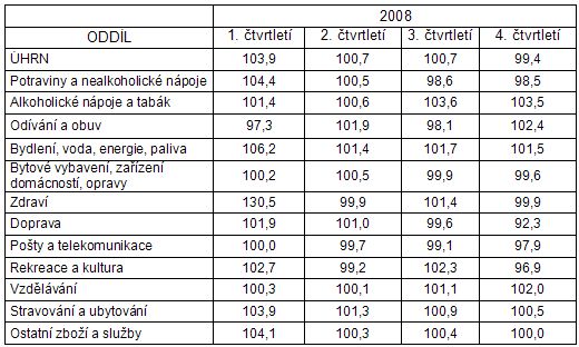 Spotřebitelské ceny klesly ve 4. čtvrtletí 2008 proti 3. čtvrtletí 2008 o 0,6 %, z toho administrativně ovlivňované (regulované) ceny vzrostly o 2,6 % a tržní ceny klesly o 1,5 %.