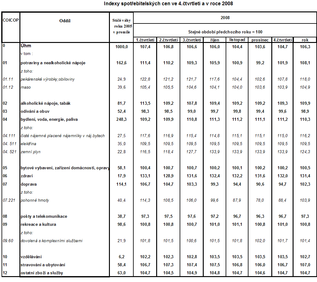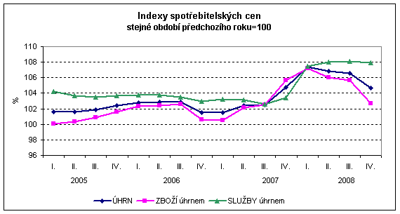 Vývoj indexů spotřebitelských cen - 4. čtvrtletí 2008 a rok 2008