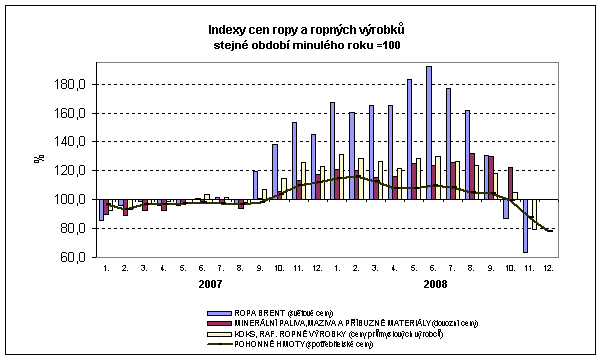 Specifický cenový vývoj zaznamenaly ceny v dopravě, kde na jedné straně působil růst cen v dopravních službách v důsledku zvýšení DPH, na druhé straně došlo k výraznému poklesu cen pohonných hmot a osobních automobilů ve 2. polovině roku 2008. Ceny pohonných hmot byly v roce 2008 vyšší než v roce 2007 o 3,9 %, z toho v 1. čtvrtletí o 14,3 %, zatímco ve 4. čtvrtletí byly meziročně nižší o 11,6 %. Ceny dopravních služeb vzrostly o 10,9 %, při čemž tento růst nastal převážně hned v lednu. Výsledkem byl výrazný cenový růst dopravy v 1.čtvrtletí 2008, který ve 4. čtvrtletí přešel v meziroční pokles.