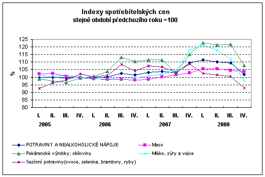 Zpomalení meziročního cenového růstu v oddíle potraviny a nealkoholické nápoje ovlivnilo zmírnění cenového růstu pekárenských výrobků a obilovin a výrobků ve skupině mléko, sýry vejce, jejichž ceny zaznamenaly výrazný vzestup ve 4. čtvrtletí 2007. Ceny chleba byly ve 4. čtvrtletí 2008 meziročně vyšší o 5,4 % (ve 3.čtvrtletí o 21,7 %), běžného pečiva o 4,3 % (ve 3. čtvrtletí o 27,0 %), mouky o 17,3 % (ve 3.čtvrtletí o 50,6 %). Ceny ve skupině výrobků mléko, sýry, vejce klesly o 2,4 % (ve 3.čtvrtletí růst o 12,1 %). Ceny olejů a tuků se zvýšily o 3,2 % (ve 3. čtvrtletí o 18,2 %). Ceny ovoce, které byly ve 3. čtvrtletí vyšší o 4,1 %, ve 4. čtvrtletí se snížily o 11,5 %.