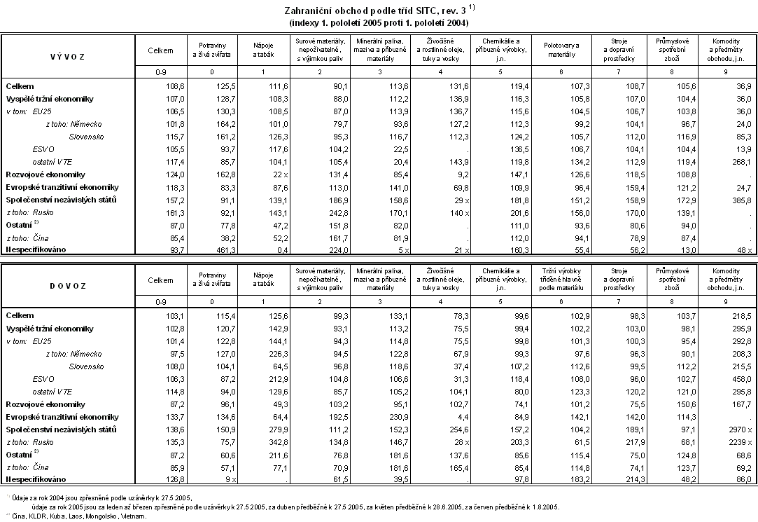 1 Všechny údaje jsou v běžných cenách. Údaje za rok 2004 jsou zpřesněné podle uzávěrky k 27. květnu 2005, údaje za rok 2005 jsou za leden až březen zpřesněné podle uzávěrky k 27. květnu 2005, za duben předběžné podle uzávěrky k 27. květnu 2005, za květen předběžné podle uzávěrky k 28. červnu 2005 a za červen předběžné podle uzávěrky k 1. srpnu 2005