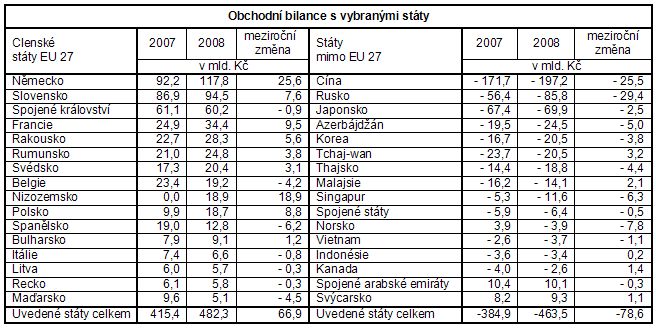 - přebytek zahraničního obchodu, který byl o 18,5 mld. Kč nižší a dosáhl 69,4 mld. Kč (krytí dovozu vývozem činilo 102,9 % proti 103,7 % v roce 2007), byl výsledkem kladných hodnot obchodní bilance (i když postupně klesajících) v 1. až 3. čtvrtletí a záporného salda zahraničního obchodu ve 4. čtvrtletí (vývoz kryl dovoz 97,2 %). Teritoriálně se aktivum obchodní bilance zvýšilo se státy EU 27 o 71,1 mld. Kč (ve 4. čtvrtletí meziročně kleslo o 6,6 mld. Kč), se státy mimo EU 27 schodek zahraničního obchodu vzrostl o 89,6 mld. Kč (ve 4. čtvrtletí byl vyšší o 27,5 mld. Kč). Přebytek obchodní bilance se snížil s evropskými tranzitivními ekonomikami o 3,3 mld. Kč a se státy ESVO o 8,2 mld. Kč. Záporné saldo zahraničního obchodu se prohloubilo se SNS 4 o 38,9 mld. Kč, s ostatními státy 5 o 26,8 mld. Kč, s ostatními vyspělými tržními ekonomikami o 5,3 mld. Kč a s rozvojovými ekonomikami o 9,1 mld. Kč. Ve zbožové struktuře došlo k navýšení přebytku zahraničního obchodu se stroji a dopravními prostředky o 15,5 mld. Kč a s polotovary a materiály o 8,9 mld. Kč. Snížení schodku zaznamenal zahraniční obchod se zemědělskými a potravinářskými surovinami a výrobky o 9,0 mld. Kč a s chemickými výrobky o 4,3 mld. Kč. Nepříznivě obchodní bilanci ovlivnilo navýšení záporného salda zahraničního obchodu se surovinami nepoživatelnými a minerálními palivy o 45,2 mld. Kč a nižší kladné saldo zahraničního obchodu s průmyslovým spotřebním zbožím o 11,1 mld. Kč;