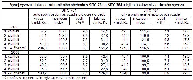- vývoz byl nižší o 0,7 % a dosáhl 2 463,1 mld. Kč, dovoz vzrostl o 0,1 % a činil 2 393,7 mld. Kč. Za uvedeným vývojem se však skrývá odlišný vývoj v jednotlivých čtvrtletích. Dosažená meziroční tempa růstu vývozu i dovozu v 1. čtvrtletí se ve 2. čtvrtletí zmírnila, ve 3. čtvrtletí přešla do meziročního poklesu, který se ve 4. čtvrtletí jak u vývozu, tak i u dovozu značně prohloubil ( meziročně klesl vývoz o 14,1 % a dovoz o 9,1 %). Nižší obrat zahraničního obchodu v roce 2008 proti roku 2007 o 13,7 mld. Kč byl vyvolán výhradně poklesem vývozu o 16,1 mld. Kč, neboť dovoz byl vyšší o 2,4 mld. Kč. V důsledku posílení CZK k EUR a zejména k USD vývoz i dovoz vyjádřený v těchto měnách zaznamenal meziročně růst - v přepočtu na EUR vývoz a dovoz o 10,6 % a 11,3 % a v přepočtu na USD o 18,8 % a 19,4 %. Vlivem mírného posílení CZK k EUR a oslabení k USD ve 4. čtvrtletí 2008 vývoz i dovoz vyjádřený v těchto měnách meziročně klesl – v přepočtu na EUR vývoz o 8,7 % a dovoz o 3,6 %, v přepočtu na USD vývoz o 17,2 % a dovoz o 12,4 %) 3 ;