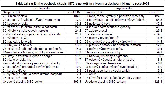 - stroje a dopravní prostředky pokles vývozu i dovozu. Úloha strojů a dopravních prostředků se na celkovém vývozu i na celkovém dovozu oslabila. Meziročně se snížil vývoz strojů a dopravních prostředků o 2,0 % (o 26,8 mld. Kč) a dovoz o 4,1 % (o 42,4 mld. Kč). Uvedené poklesy vývozu i dovozu byly ze všech tříd SITC největší, a proto významně v roce 2008 ovlivňovaly celkový vývoj zahraničního obchodu. Kladné saldo zahraničního obchodu se stroji a dopravními prostředky dosáhlo 330,9 mld. Kč proti 315,4 mld. Kč v roce 2007, z toho se státy EU 27 činilo 462,7 mld. Kč (z toho s Německem 119,3 mld. Kč). Přebytek obchodní bilance zaznamenaly všechny strojírenské skupiny. Nejvyšší aktivum bylo patrné u silničních vozidel (184,6 mld. Kč, z toho 158,1 mld. Kč se státy EU), dále pak u strojů a zařízení všeobecně užívaných v průmyslu (47,0 mld. Kč, z toho 37,0 mld. Kč se státy EU), zařízení pro telekomunikaci a pro záznam a reprodukci zvuku (24,9 mld. Kč, z toho 90,8 mld. Kč se státy EU), výpočetní techniky (21,9 mld. Kč, z toho 104,7 mld. Kč se státy EU), elektrických zařízení, přístrojů a spotřebičů (15,3 mld. Kč, z toho 56,3 mld. Kč se státy EU), strojů a zařízení k výrobě energie (13,2 mld. Kč, z toho 4,6 mld. Kč se státy EU), ostatních dopravních a přepravních prostředků (11,5 mld. Kč, z toho 4,7 mld. Kč se státy EU) a strojního zařízení pro určitá odvětví průmyslu (10,9 mld. Kč, z toho 3,3 mld. Kč se státy EU);