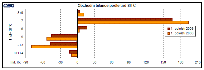 - stroje a dopravní prostředky propad vývozu i dovozu o více než jednu pětinu. Zastoupení strojů a dopravních prostředků na celkovém vývozu i na celkovém dovozu oslabilo. Meziročně se snížil vývoz strojů a dopravních prostředků o 21,0 % (149,2 mld. Kč) a jejich dovoz o 23,5 % (121,1 mld. Kč). Absolutní pokles vývozu i dovozu byl ze všech tříd SITC největší a výrazně tak ovlivnil celkový propad zahraničního obchodu. Kladné saldo zahraničního obchodu se stroji a dopravními prostředky dosáhlo 165,3 mld. Kč proti 193,4 mld. Kč v 1. pololetí 2008 (se státy EU 231,1 mld. Kč proti 256,7 mld. Kč). Aktivum obchodní bilance zaznamenaly všechny strojírenské skupiny. Nejvyšší přebytek zahraničního obchodu byl patrný u silničních vozidel, dále pak u strojů a zařízení všeobecně užívaných v průmyslu, výpočetní techniky, zařízení pro telekomunikace a pro záznam a reprodukci zvuku, ostatních dopravních a přepravních prostředků a strojů a zařízení k výrobě energie;