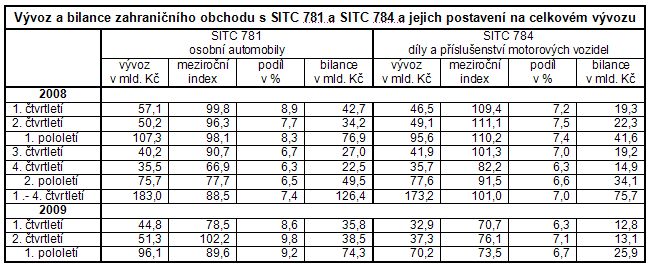 Ve vývozu výrobků zpracovatelského průmyslu přetrvávala v 1. pololetí 2009 nejsilnější úloha strojů a dopravních prostředků, z nich pak silničních vozidel, elektrických zařízení, přístrojů a spotřebičů, výpočetní techniky, strojů a zařízení všeobecně užívaných v průmyslu a telekomunikačních zařízení. Silniční vozidla se v 1. pololetí 2009 podílela na celkovém vývozu 16,9 % (17,0 % v 1. pololetí 2008), z toho osobní automobily 9,2 % a díly a příslušenství motorových vozidel 6,7 %. Kladné saldo zahraničního obchodu se silničními vozidly bylo v 1. pololetí 2009 ze všech tříd SITC stále nejvyšší (100,3 mld. Kč), meziročně ale o 9,7 mld. Kč nižší (kleslo u osobních automobilů o 2,6 mld. Kč a u dílů a příslušenství motorových vozidel o 15,7 mld. Kč).