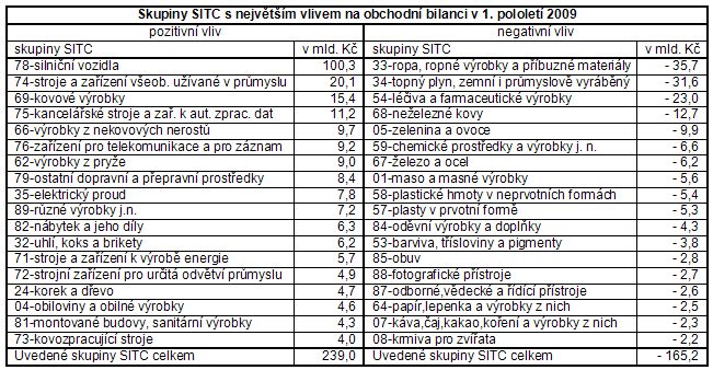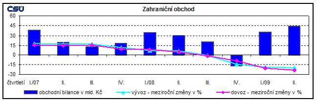 - kladné saldo zahraničního obchodu vzrostlo o 15,3 mld. Kč a dosáhlo 79,4 mld. Kč (krytí dovozu vývozem činilo 108,2 % v 1. pololetí 2009 proti 105,2 % v 1. pololetí 2008). Přebytek bilance zahraničního obchodu byl vyšší ve 2. čtvrtletí 2009 (44,1 mld. Kč) oproti 1. čtvrtletí 2009 (35,3 mld. Kč). Teritoriálně aktivum obchodní bilance kleslo se státy EU o 18,1 mld. Kč, se státy mimo EU byl schodek zahraničního obchodu nižší o 33,4 mld. Kč. Aktivum obchodní bilance se snížilo se státy ESVO o 4,6 mld. Kč a s evropskými tranzitivními ekonomikami o 1,7 mld. Kč. Záporné saldo zahraničního obchodu kleslo se SNS 5 o 29,0 mld. Kč, s rozvojovými ekonomikami o 7,2 mld. Kč, s ostatními vyspělými tržními ekonomikami o 4,8 mld. Kč a s ostatními státy 6 o 2,8 mld. Kč. Ve zbožové struktuře došlo k navýšení přebytku u zahraničního obchodu s polotovary a materiály o 13,5 mld. Kč a k jeho poklesu u strojů a dopravních prostředků o 28,1 mld. Kč a u průmyslového spotřebního zboží a zboží j.n. o 6,9 mld. Kč. Zmírnění schodku zaznamenal zahraniční obchod se surovinami nepoživatelnými a minerálními palivy o 32,4 mld. Kč a s chemickými výrobky o 8,0 mld. Kč, navýšení pasiva o 3,6 mld. Kč bylo zřejmé u zemědělských a potravinářských surovin a výrobků;