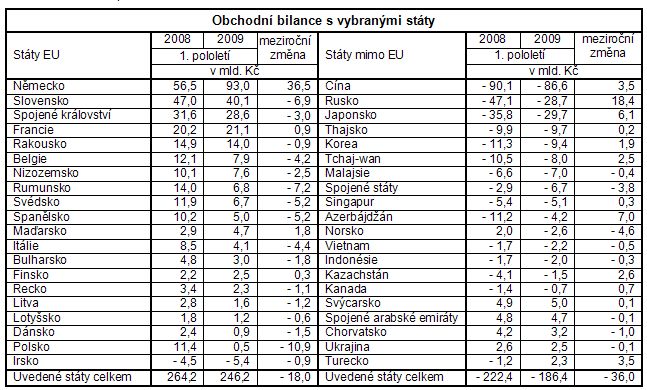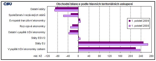 Obchodní bilance a její meziroční změny u jednotlivých teritoriálních uskupení byly odrazem vývoje salda zahraničního obchodu s hlavními partnerskými státy. Na celkový přebytek zahraničního obchodu se státy EU měla značný vliv (196,8 mld. Kč) kladná bilance obchodu s pěti státy (Německo, Slovensko, Spojené království, Francie a Rakousko), která byla meziročně vyšší o 26,6 mld. Kč. Z celkového schodku obchodní bilance se státy mimo EU na tři státy (Čína, Rusko a Japonsko) připadl deficit 145,0 mld. Kč proti 173,0 mld. Kč v 1. pololetí 2008.
