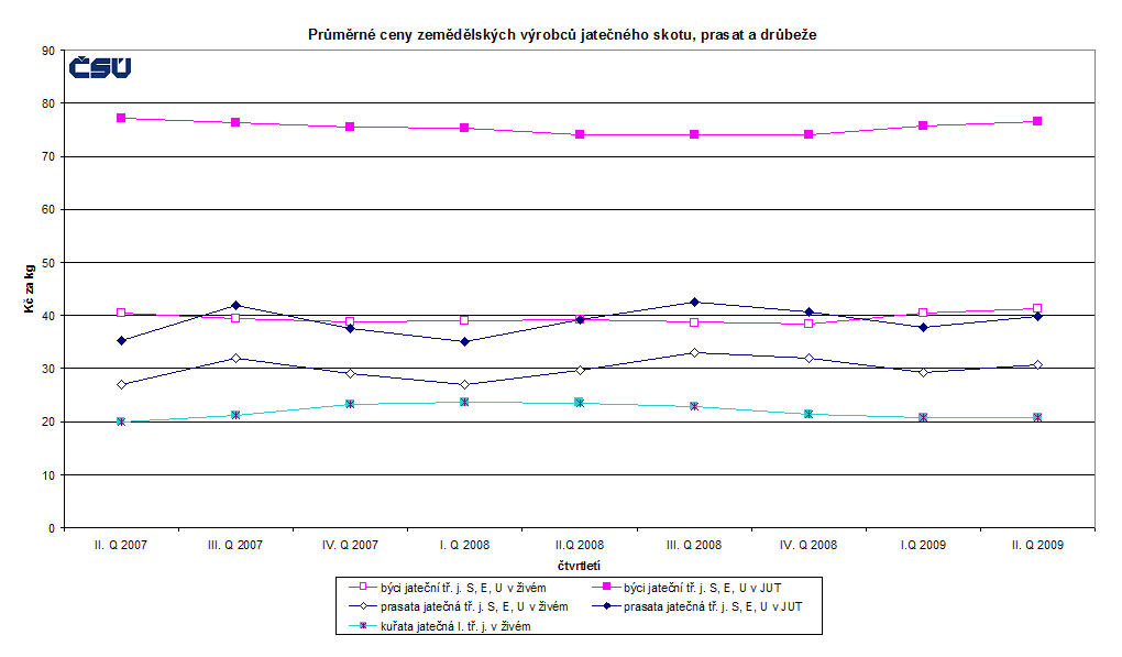 Zdroj dat: Vyčerpávající šetření ČSÚ u ekonomických subjektů, které poráží hospodářská zvířata a Indexy cen zemědělských výrobců za červen 2009 (ČSÚ).