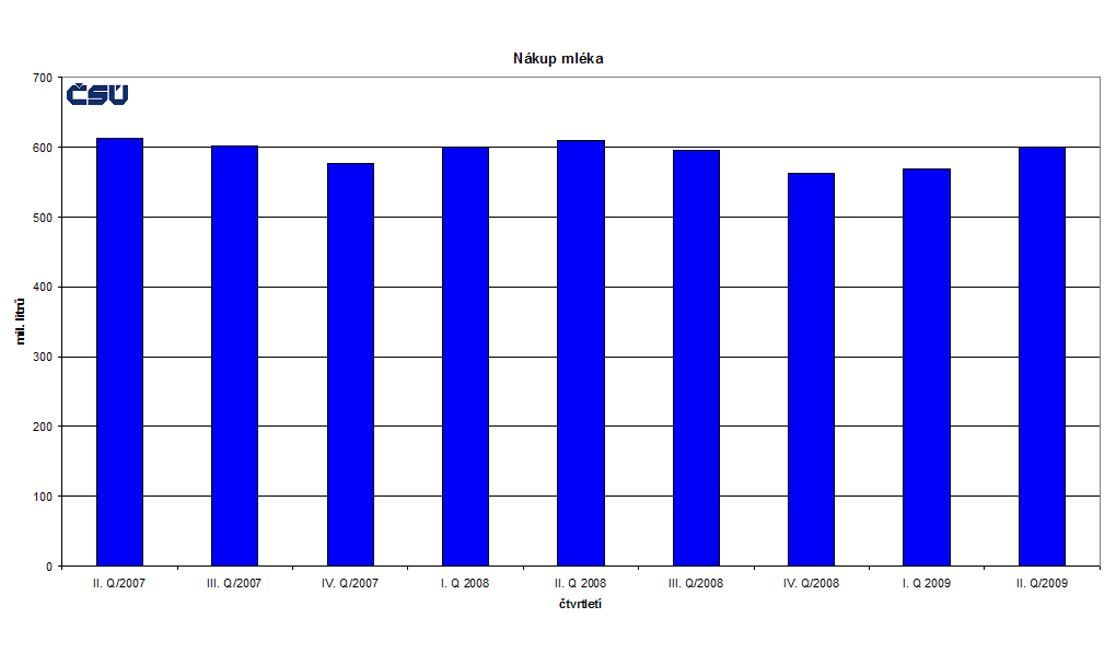 Ve 2. čtvrtletí 2009 nakoupily mlékárny téměř 600 mil. litrů mléka. V porovnání se stejným obdobím minulého roku se nákup mléka snížil o 1,5 %.