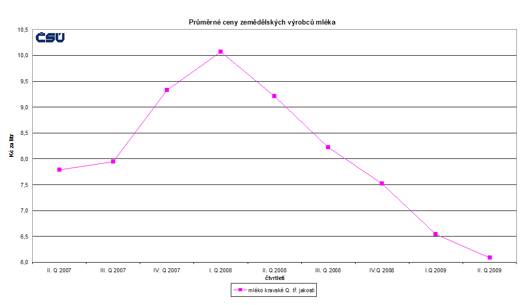 V 2. čtvrtletí 2009 pokračoval meziroční propad cen zemědělských výrobců mléka. Průměrná cena mléka nejvyšší třídy jakosti Q se meziročně snížila o 33,9 %. Mléko se nakupovalo za průměrnou cenu 6,09 Kč za litr.