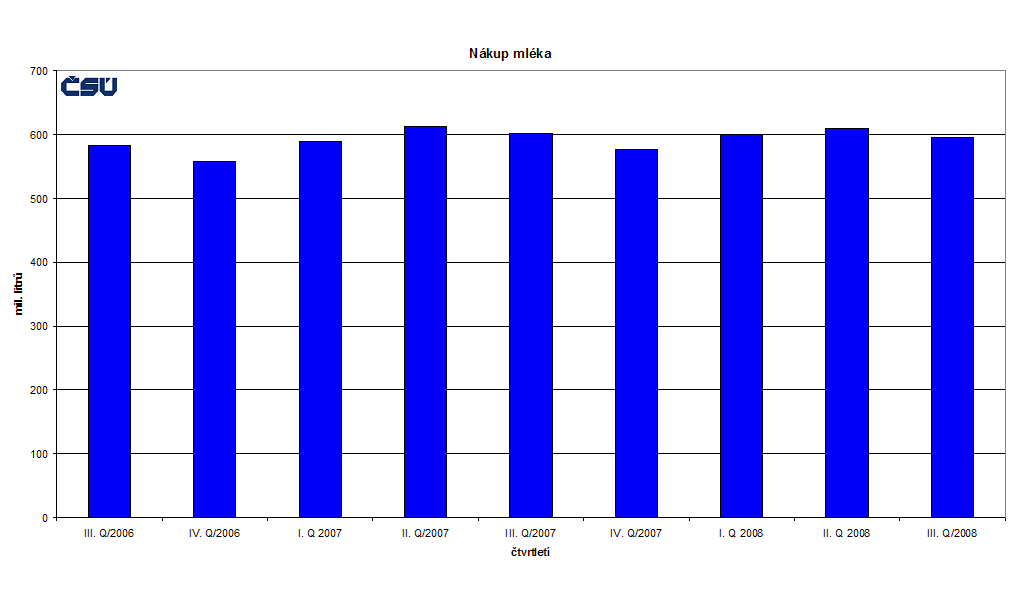 V 3. čtvrtletí 2008 nakoupily mlékárny 596,1 mil. litrů mléka, což bylo o 1,1 % méně než ve stejném období minulého roku.