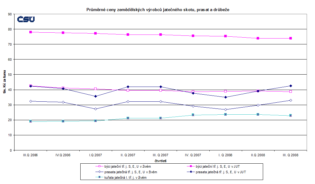 Výrazný meziroční růst cen zemědělských výrobců jatečných prasat, který byl zaznamenán v jednotlivých měsících 2. čtvrtletí 2008 se v průběhu 3. čtvrtletí 2008 zpomalil. Ceny jatečných prasat se ve 3. čtvrtletí meziročně zvýšily o 3,2 %. Průměrná cena jatečných prasat tříd jakosti S,E,U stoupla na 33,03 Kč za 1 kg v živém a 42,52 Kč za 1 kg v JUT.