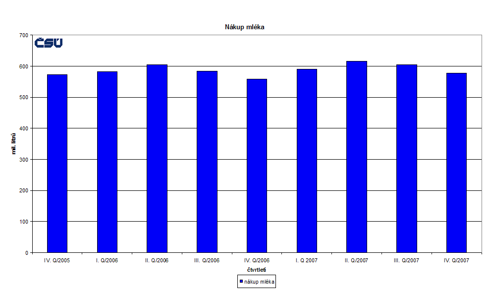 Ve 4. čtvrtletí 2007 nakoupily mlékárny 578,2 mil. litrů mléka. Proti 4. čtvrtletí 2006 se nákup mléka zvýšil o 3,6 %.