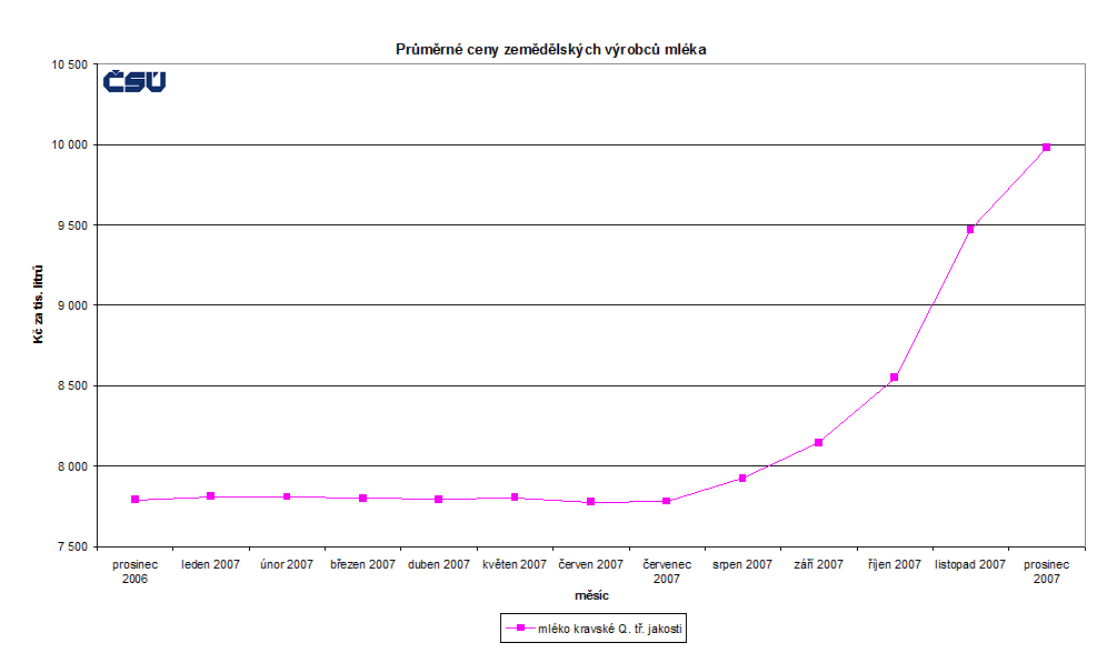 Ceny zemědělských výrobců mléka zaznamenaly ve 4. čtvrtletí 2007 výrazný meziroční vzestup, a to o 20,7 %. Mléko nejvyšší třídy jakosti Q bylo nakupováno od zemědělců za průměrnou cenu 9,33 Kč za litr.