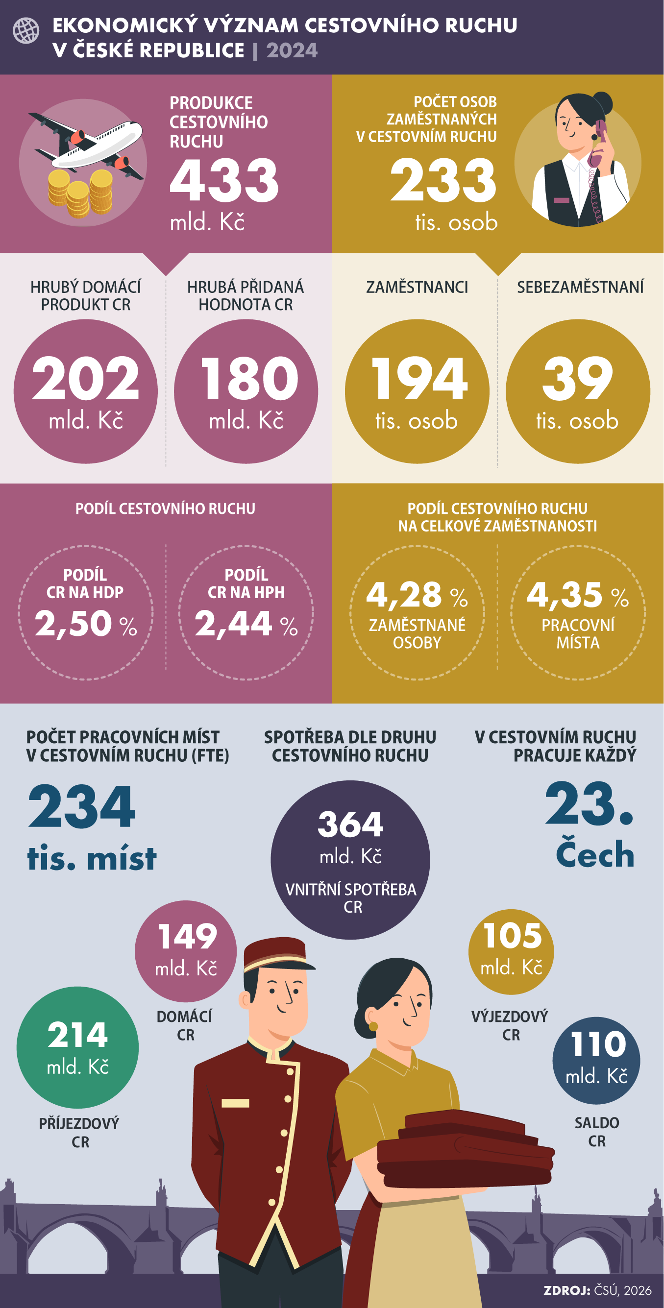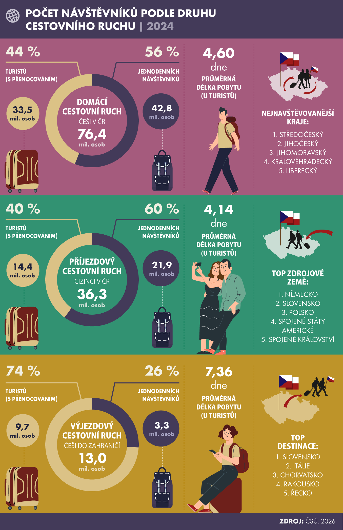 V roce 2024 navštívilo Českou republiku 36,3 miliónu zahraničních návštěvníků (meziročně o 6,9 % více). Naopak čeští občané realizovali 76,4 miliónů cest v tuzemsku a 13,0 miliónu cest do zahraničí. V případě výjezdového cestovního ruchu byla zaznamenána nejdelší průměrná délka pobytu (7,4 dne). Nejvyšší podíl jednodenních návštěv byl zjištěn v příjezdovém cestovním ruchu (60 %).