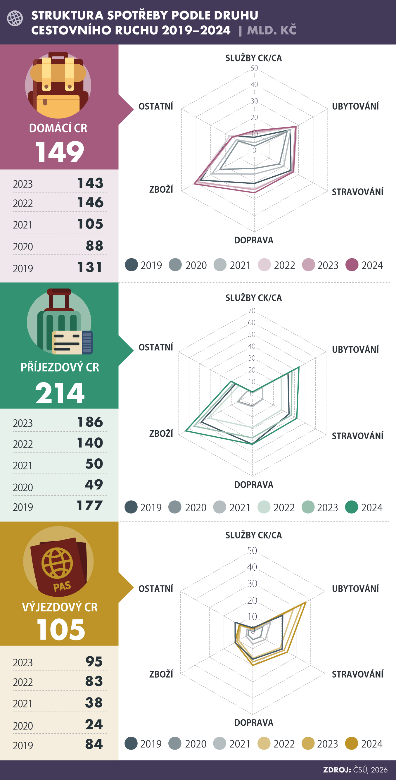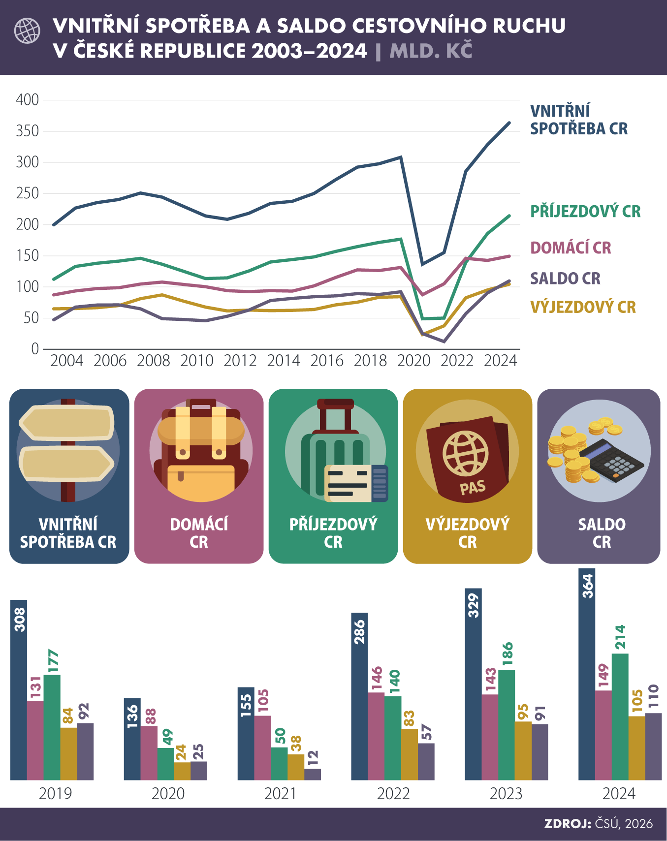 Celkový objem výdajů za cestovní ruch dosáhl 363,7 miliard korun. Jedná se o souhrnný ukazatel poptávky všech návštěvníků, kteří trávili svou dovolenou v Česku. V roce 2024 byl v meziročním srovnání o 10,7 % vyšší. Zároveň dosáhl nejvyšší hodnoty od začátku sledování v roce 2003.