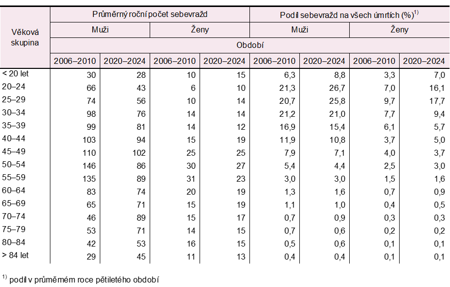 Tab. 1.2 Sebevraždy podle pohlaví a věku v letech 2006–2010 a 2020–2024