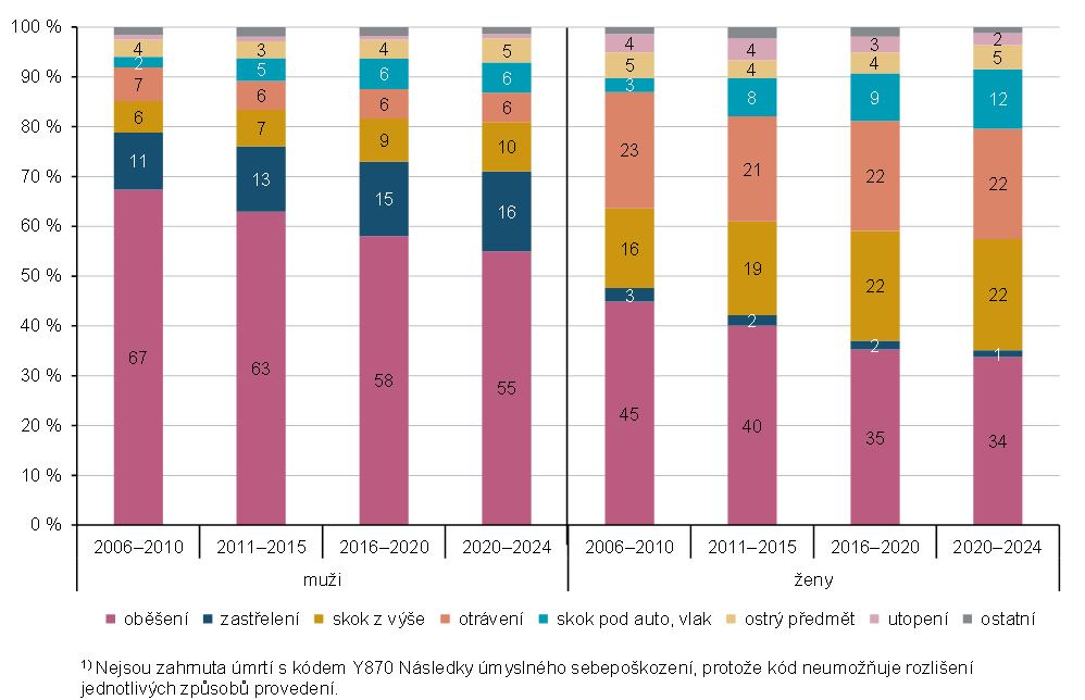 Obr. 1.3 Struktura sebevražd1) podle způsobu provedení a pohlaví v letech 2006 až 2024