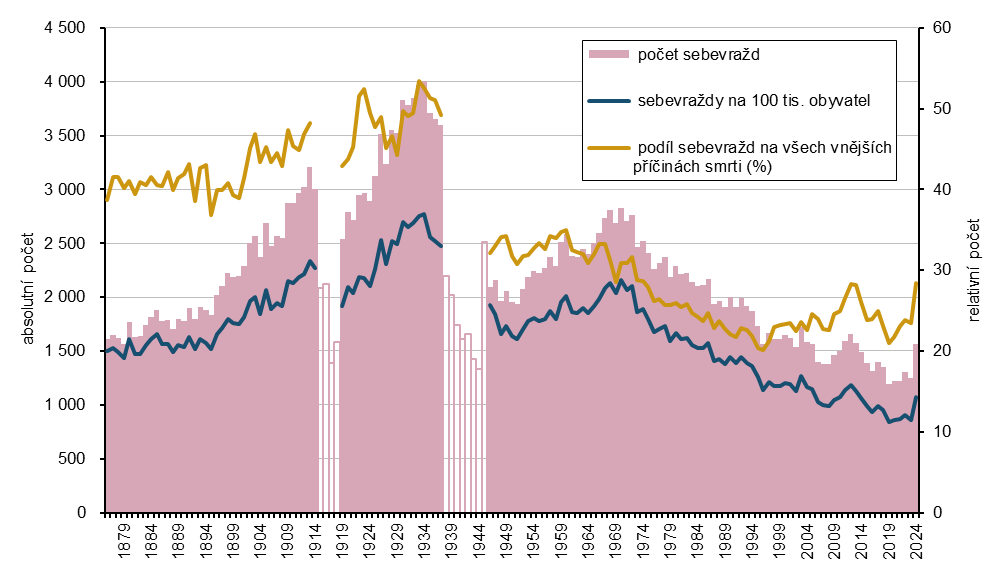 Počet lidí, kteří spáchají sebevraždu, má od 70. let 20. století, i přes četné lokální výkyvy a krátkodobá období růstu, klesající trend. Prozatím nejnižší počet zemřelých sebevraždou, 1 191 osob, byl zaznamenán v roce 2019, poválečné maximum patří roku 1970 s 2 824 sebevraždami. V letech 2015–2018 se počet sebevražd držel těsně pod 1,4 tisíci případů ročně, v roce 2019 došlo k poklesu (již zmiňované minimum) a v následujících třech letech (2020–2023) se roční počet sebevražd pohyboval mírně nad 1,2 tisíci. V roce 2024 počet sebevražd meziročně o 308 stoupl na 1 561 dokonaných skutků; podobný byl výskyt sebevražd naposledy v roce 2013. Meziroční nárůst v roce 2024 byl nejvyšší za celé 21. století, značně ho ale podpořila novinka v metodice sběru dat, nová validace spočívající ve zpřesnění zjištěných příčin smrti a typu úmrtí podle údajů Policie ČR.