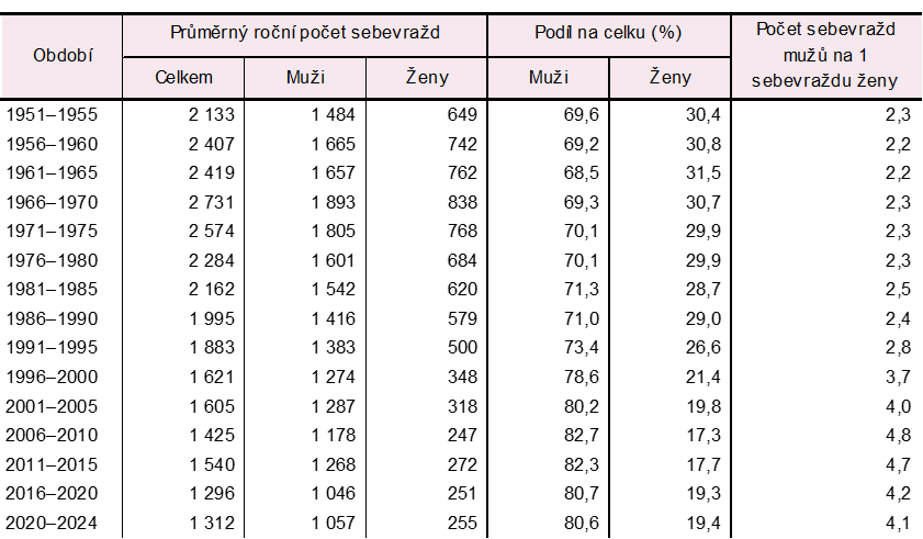 Tab. 1.1 Sebevraždy podle pohlaví v letech 1951–2024