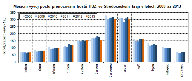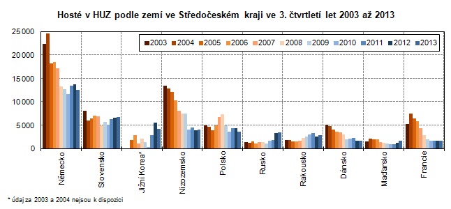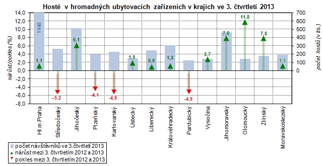 Podle předběžných údajů přijelo v průběhu 3. čtvrtletí 2013 do hromadných ubytovacích zařízení1 (dále jen HUZ) ve Středočeském kraji celkem 264 714 návštěvníků2. Na celkovém počtu ubytovaných hostů v České republice se kraj podílel 5,5 %. Největší počet turistů byl ubytován v Hl. m. Praze (podíl na ČR 34,2 %), nejméně pak v Pardubickém kraji (2,6 %). V porovnání se stejným obdobím předchozího roku se počet hostů ve Středočeském kraji snížil o 5,2 %. Meziroční pokles zaznamenaly ještě Karlovarský kraj (o 4,9 %), Pardubický kraj (o 4,9 %) a Plzeňský kraj (o 4,1 %). U ostatních krajů došlo naopak k meziročnímu nárůstu, nejvyšší byl v Olomouckém kraji o 11,8 %, v Jihomoravském (o 7,8 %) a Zlínském kraji (o 7,8 %).