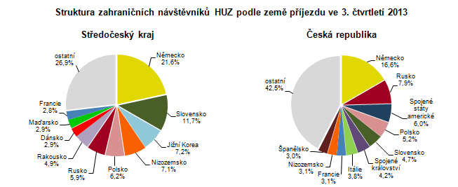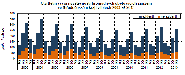 Mezi nejčastější hosty ubytovacích zařízení Středočeského kraje patřili ve 2. čtvrtletí 2013 tuzemští návštěvníci, tzv. rezidenti3 (77,9 %). Těch se ubytovalo o 14,4 tisíc méně než ve stejném období předchozího roku, což znamenalo pokles návštěvnosti o 5,5 %. O něco nižší meziroční pokles byl zaznamenán u hostů přijíždějících ze zahraničí, tzv. nerezidentů4 (o 3,8 % méně).