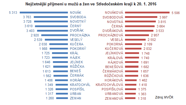 Nejčetnějším příjmením obyvatel Středočeského kraje byla podle statistik MVČR k 20. 1. 2016 kombinace Novák/Nováková (společně 10,8 tis. osob), následovali Svoboda/Svobodová (7,8 tis.), Novotný/Novotná (7,5 tis. osob), Černý/Černá (7,3 tis.) a Dvořák/Dvořáková (6,9 tis.). V celé republice bylo pořadí prvních tří příjmení stejné, čtvrté a páté pořadí bylo opačné – čtvrtí byli Dvořák/Dvořáková a pátí Černý/Černá.